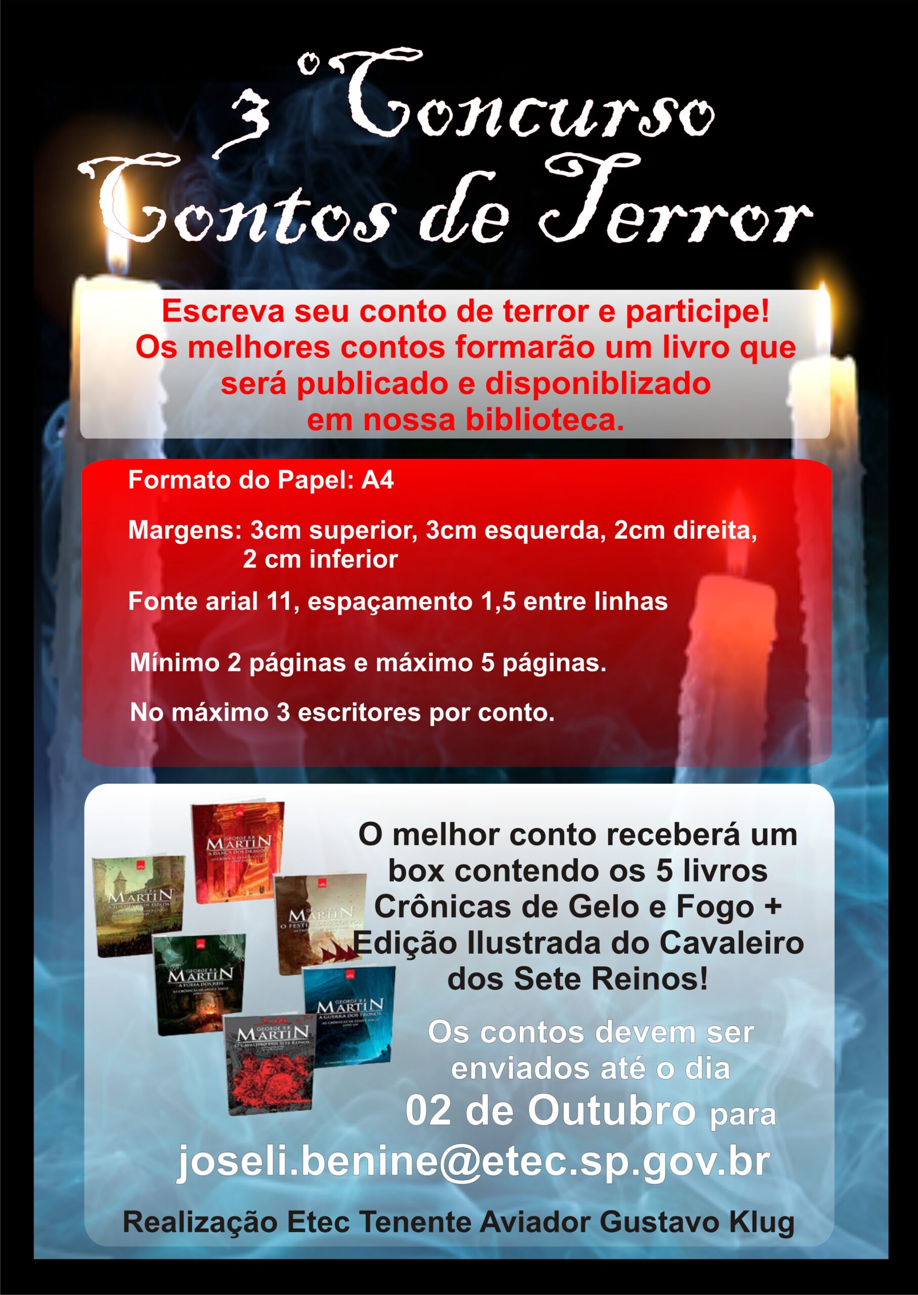 A Etec Tenente Aviador Gustavo Klug está realizando o 3º Concurso Contos de Terror. A escola já produziu dois livros dos contos dos anos anteriores, e chega agora a sua terceira edição. O prêmio para o melhor conto será os cinco livros que compõem a saga Crônicas de Gelo e Fogo, mais o livro ilustrado do Cavaleiro dos Sete Reinos.
