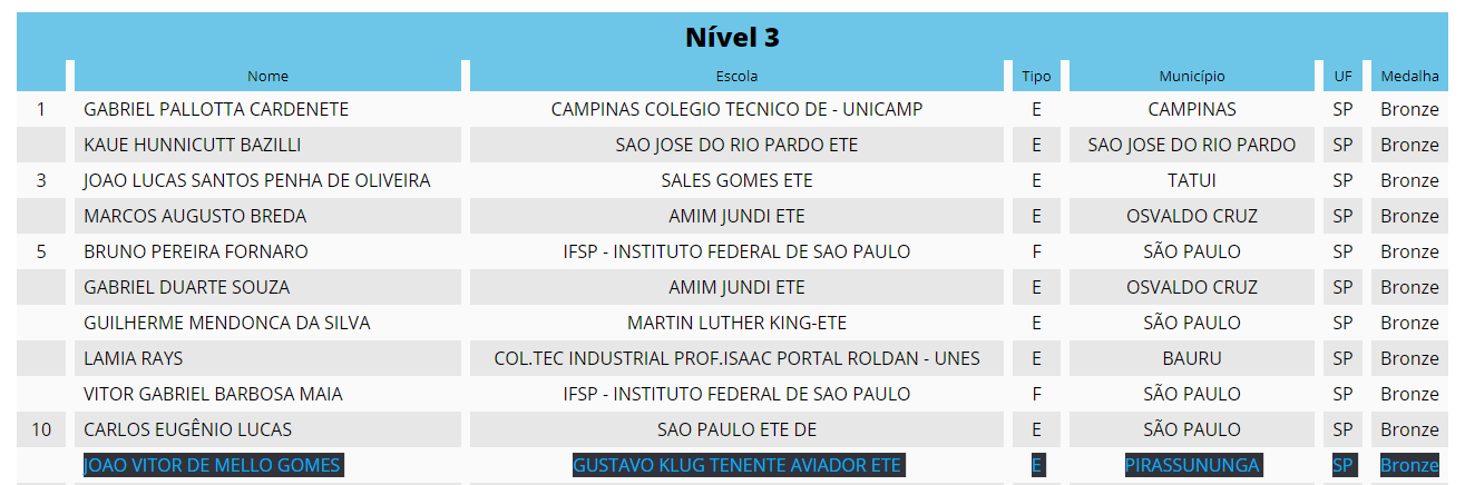 Na competição da Olimpíada Brasileira de Matemática (OBMEP), uma realização do Instituto Nacional de Matemática Pura e Aplicada – IMPA – e que tem como objetivo estimular o estudo da matemática e revelar talentos na área, em sua 13º edição e umas das competições mais disputadas por estudantes do país inteiro, o estudante João Vitor de Mello Gomes, da Etec Tenente Aviador Gustavo Klug, alcançou a medalha de bronze, ficando entre os melhores estudantes de matemática do país.