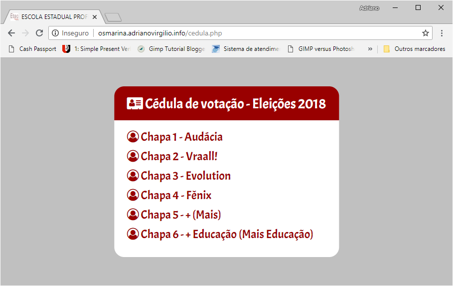 Alunos do curso Técnico em Informática participaram nesta terça-feira 10/04/2018, da Eleição para escolha do Grêmio Estudantil da Escola Estadual Professora Osmarina Sedeh Padilha, desenvolvendo uma URNA eletrônica virtual On-line a fim de torna o processo de escolha da nova chapa mais rápido e interativo.