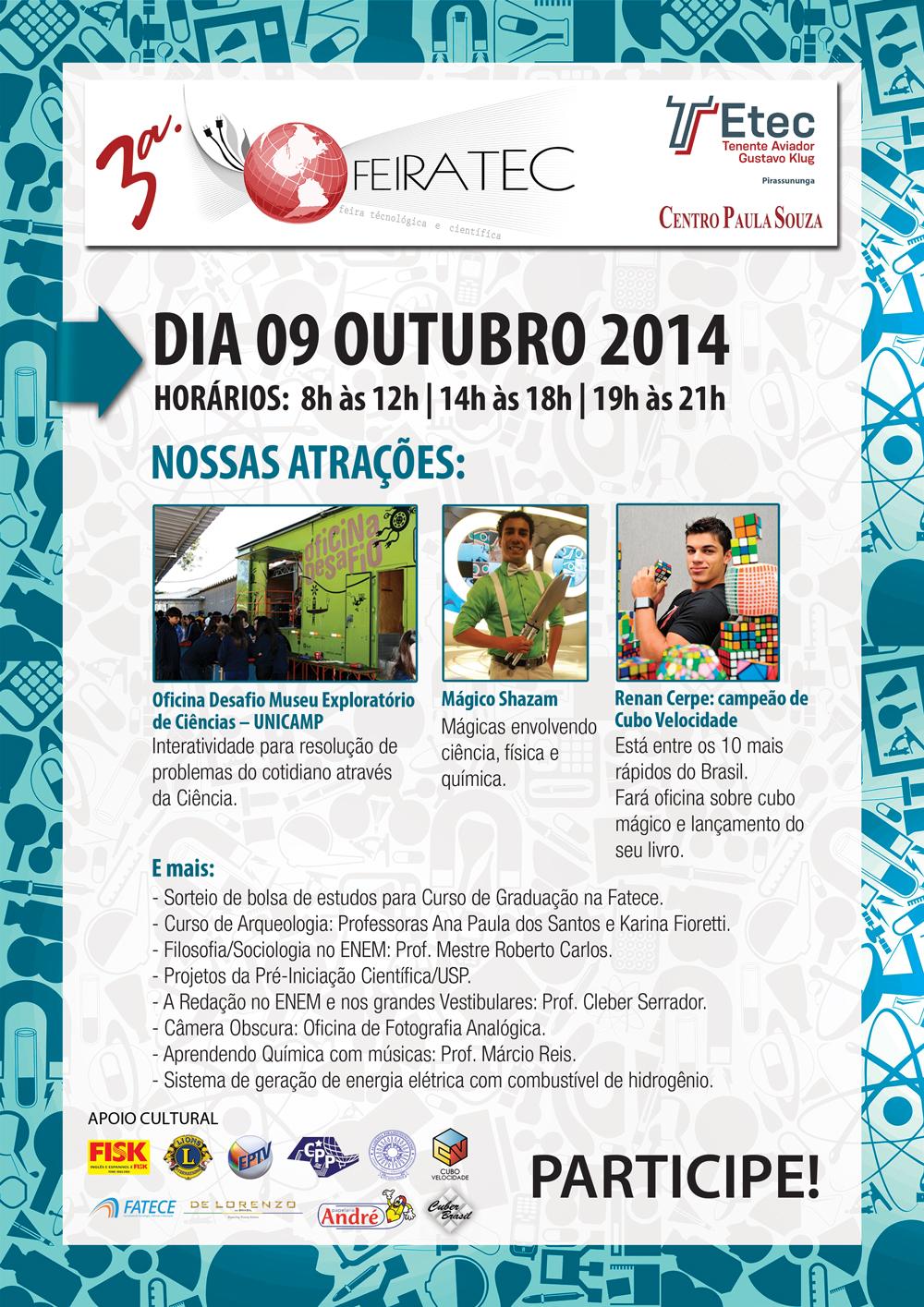 Roteiro de apresentação das Atrações – 3ª. FEIRA TEC Período da Manhã – Abertura 8h Exposição de ProjetosExposição de Projetos de alunos e egressosLocal e Horário: Quadra de Esportes – 8h às 12hPúblico: público geral Professora […]