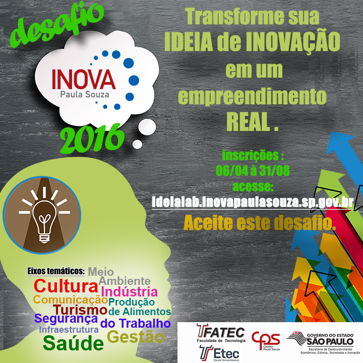 Se você tem algum projeto criativo elaborado com seus colegas de sala, professores ou amigos voltado para melhoria de um serviço ou a inovação de um negócio, participe Desafio Inova 2016.