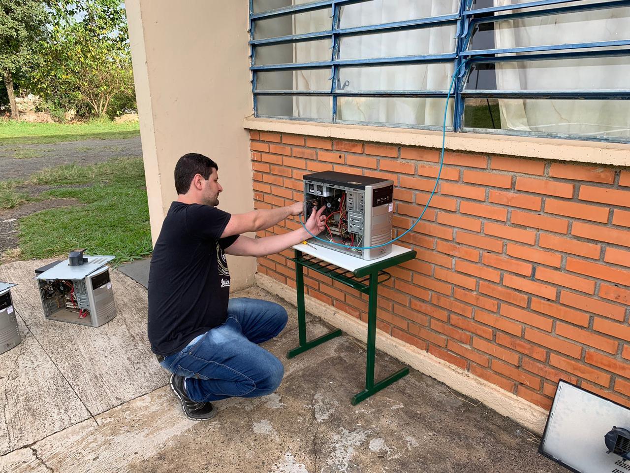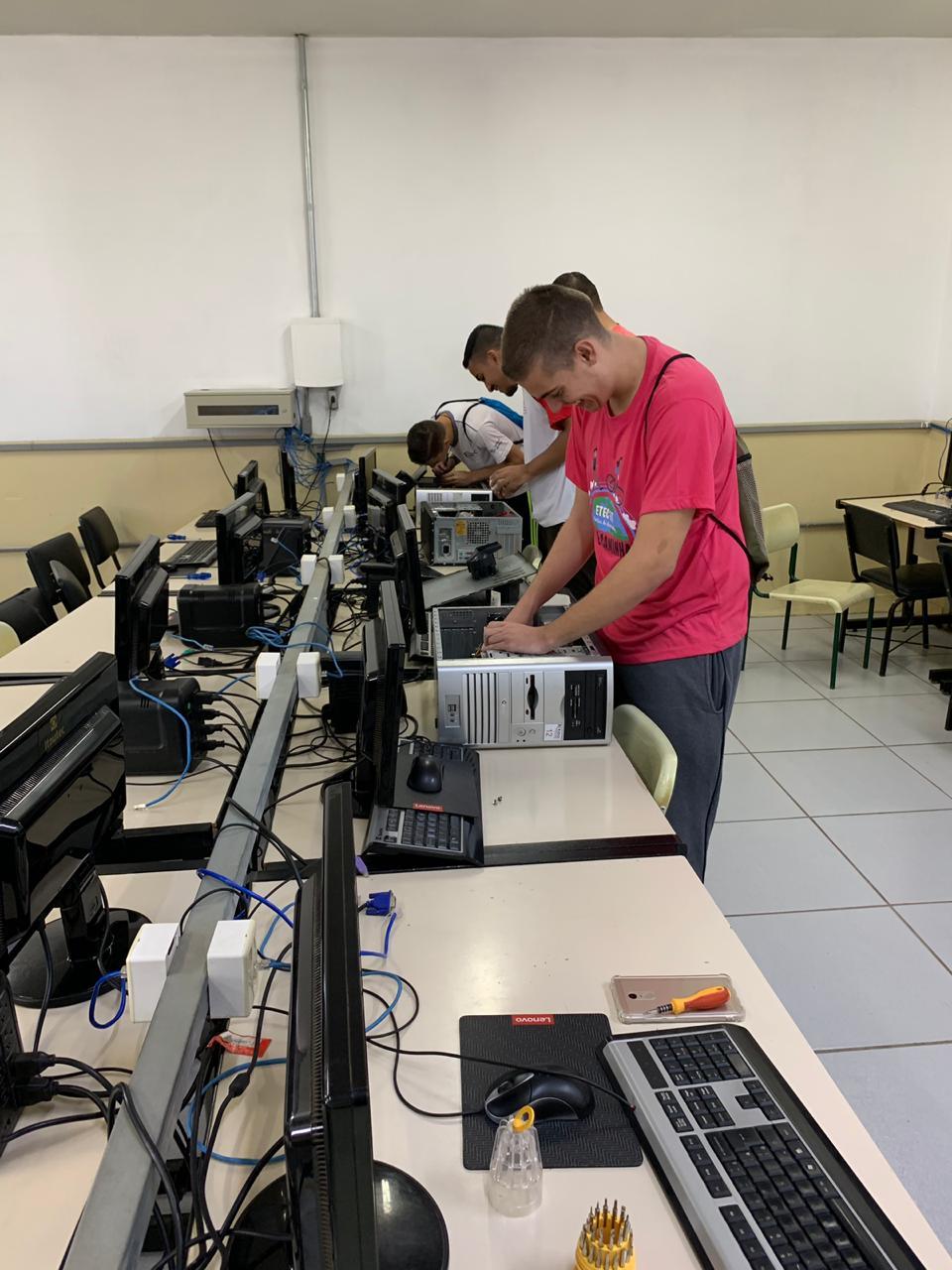 No dia 13 de abril de 2019, o diretor Luis Arthur, juntamente com o coodenador de laboratório Thiago P. Marquesini, o professor João Alexandre Baldovinotti e alunos do ETIM Informática realizaram um mutirão na Etec Tenente Aviador Gustavo Klug para manutenção corretiva, preventiva e pedritiva dos laboratórios de informática. Nessa manutenção foram efetuadas trocas de equipamentos, limpeza dos computadores, instalação, atualização de programas e cabeamento nesses ambientes, deixando-os prontos para as aulas práticas. Em breve a ação será repetida para outros laboratórios e também para a unidade II localizada à rua Antonio Magnani, 232, Vila Pinheiro. A ETEC parabeniza todos os envolvidos no evento e agradece ao serviço voluntário que prestaram.