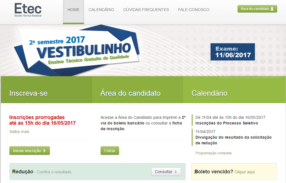 As inscrições para o vestibulinho da Escola Técnica Estadual – Etec Tenente Aviador Gustavo Klug para o segundo semestre de 2017 foram prorrogadas até às 15h de terça-feira (16).