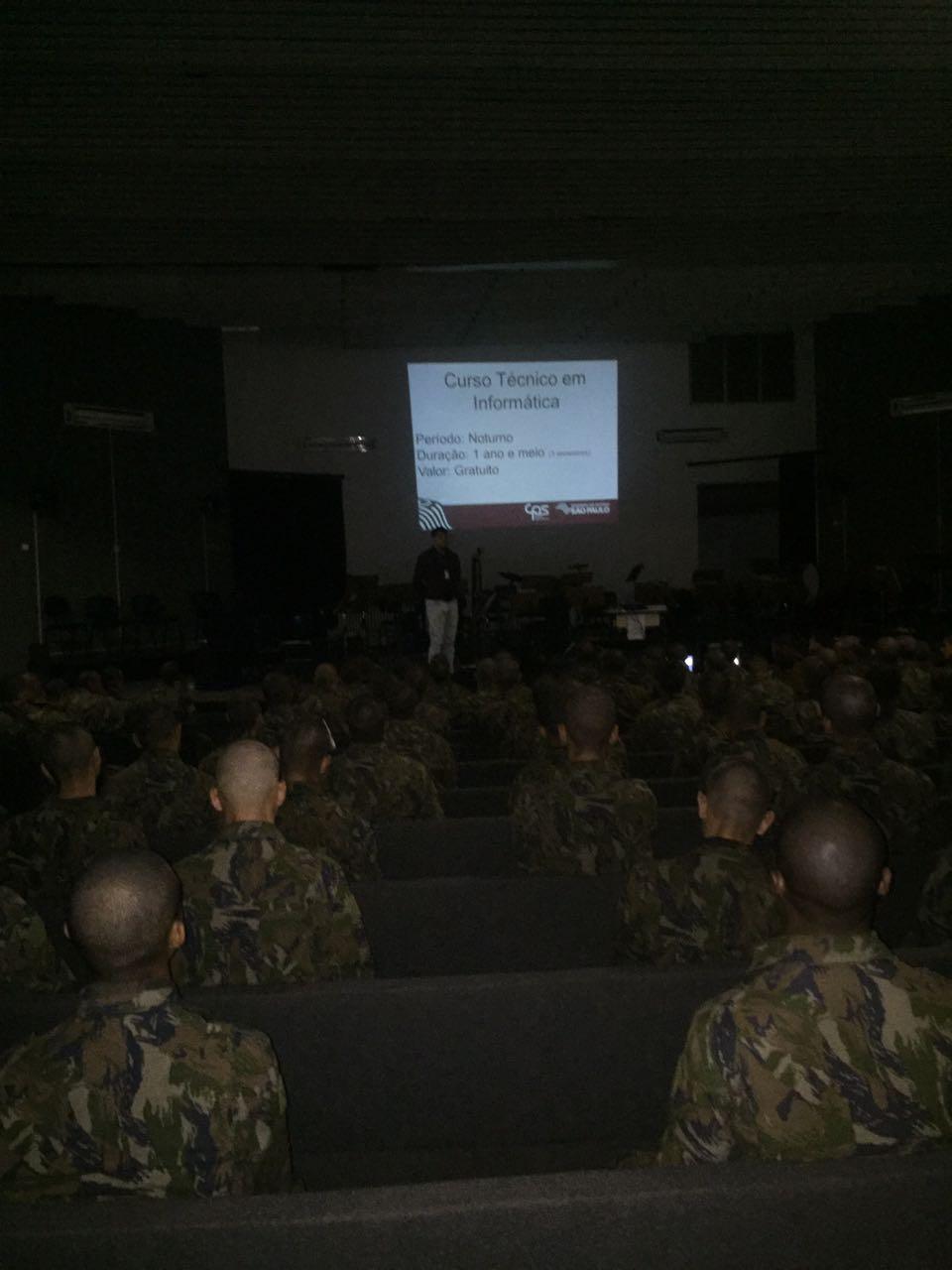 Na manhã do dia 02 de maio, a Etec Tenente Aviador Gustavo promoveu no auditório do BINFA (BATALHÃO DE INFANTARIA), na Academia da Força Aérea a divulgação dos Cursos Técnicos em Administração, Automação Industrial, Informática e Recursos Humanos, com abertura do evento pelo Diretor Luiz Arthur Malta Pereira e realizada pela professora Patrícia Sinoti Habermann, e os professores Adriano Virgílio e Lucas.